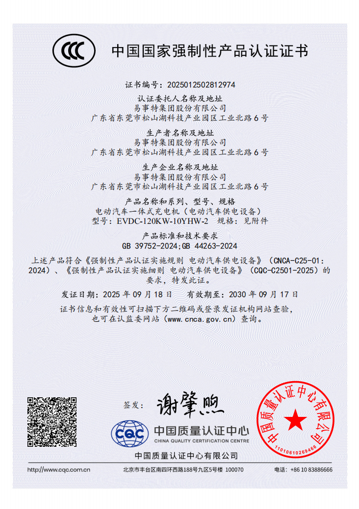 The 120kW integrated EV charger independently developed by EVCCE (EAST Group) has passed strict testing and assessment by the China Quality Certification Center (CQC) and obtained the China Compulsory Certification (CCC).This achievement confirms that the product meets China’s highest national safety and compliance standards, demonstrating EVCCE’s leading expertise and forward-looking layout in EV charging technology.